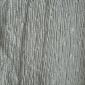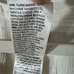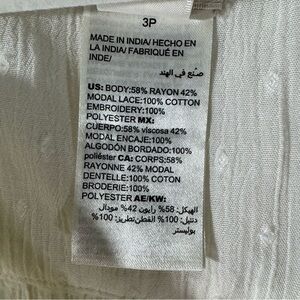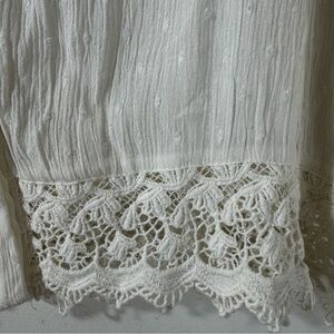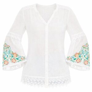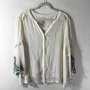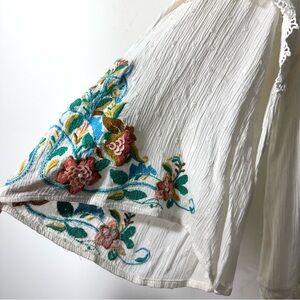 Chico’s white Swiss dot gauze tunic with colorful embroidered bell sleeves and lace trim