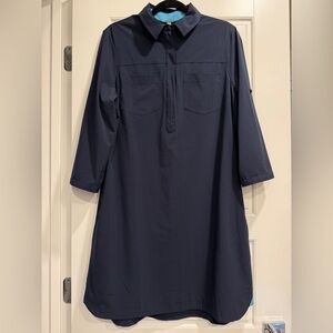 Adorable lightweight packable dress. Top is a collared 1/4 zip style. Long sleeves with a roll tab option. Invisible side pockets and a flattering rounded hem with contrasting blue hit. Perfect for outdoor adventures camping, fishing, hiking, trail walks etc