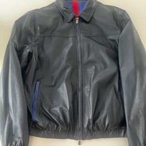 Stylish black leather jacket with blue accents. Perfect for a sleek, modern look.