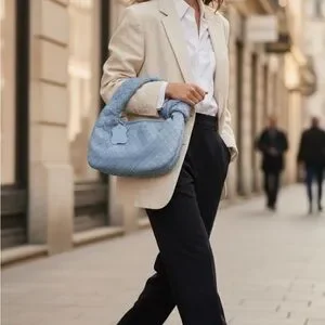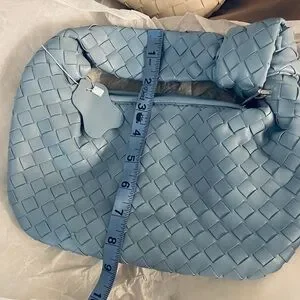 Add a touch of sophistication with this elegant sky blue woven mini bag. Perfect for any occasion.