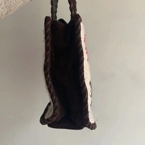 Moschino purse with amazing crochet detail in front and back. The rest of the bag is rich brown leather. The inside is in brand new condition and has on zipper pocket and two small side pockets. The leather is in great condition and the crochet part of the bag is in gently used condition with some spots that are slightly pulled but in no way take away from the beauty of this purse!