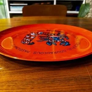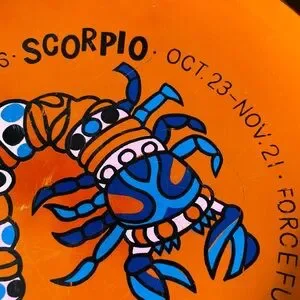 Vintage 70s orange Scorpio astrology tray. This super retro serving tray features a vibrant blue and orange scorpion design, with Scorpio traits written around the edge. This is the kind of unique vintage item that you can’t replace with modern goods…it’s just too cool.