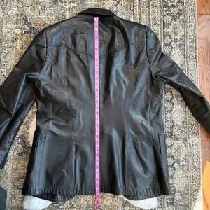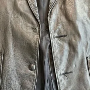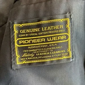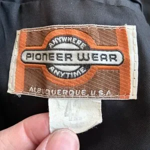 Pioneer Wear Albuquerque genuine leather blazer in a classic black finish. This vintage western-inspired piece features a notched lapel, two-button front closure, and large front patch pockets with unique stitching details. The back is designed with a western yoke and a center vent for a comfortable fit, while the interior is fully lined for smooth layering. Crafted in the USA, this jacket offers a rugged yet sophisticated aesthetic suitable for a variety of styles. Note that one button is missing and there is some light wear consistent with vintage leather; the button that has come off is intact and will be shipped with the blazer.