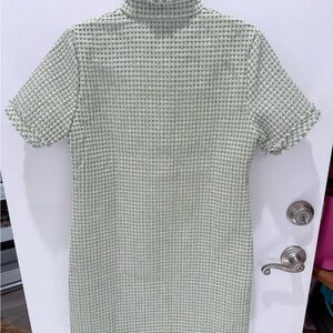 Chic green tweed dress with short sleeves. Features a high collar and front pockets.