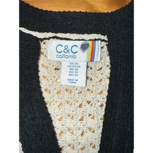Keywords: C&C California sweater, open knit pullover, ivory cream sweater, black contrast trim, V-neck sweater, long sleeve knit, lightweight breathable, relaxed fit top, longer back hem, women's XS, layering sweater, coastal casual, spring fall sweater, weekend outfit, casual chic top