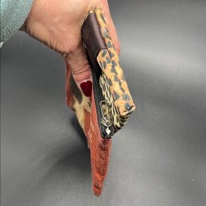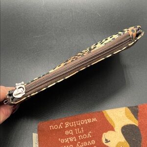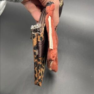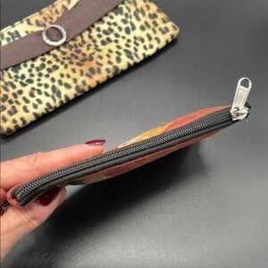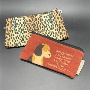 This is a two pouch set. One brick red Primitives by Kathy pouch that says “every meal you make every bite you take I’ll be watching you” it measures about 6 3/4“ x 4”. The other pouch is a nylon animal print with a setting band and rhinestone embellishment.