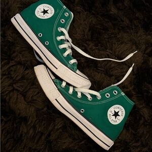 Emerald green high-tops featuring white laces and soles. Converse branding inside.