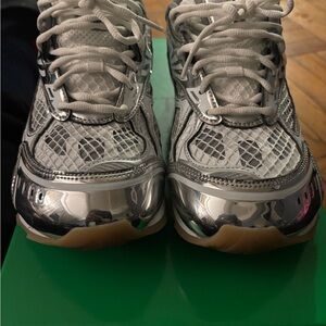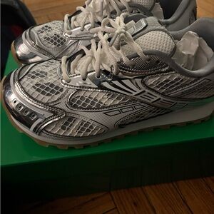 Stylish athletic shoes with a sleek silver and white design. Features intricate detailing and durable construction.