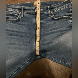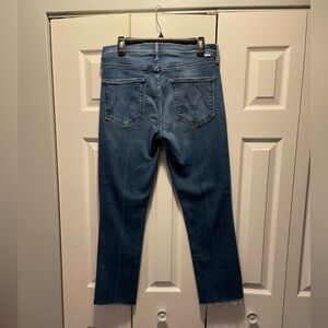 A mid-rise straight leg with an ankle-length inseam and a frayed hem. Cut from denim with a touch of stretch, Opposites Attract is a mid-blue wash with whiskering and fading at the knee.