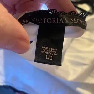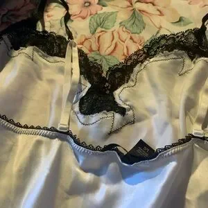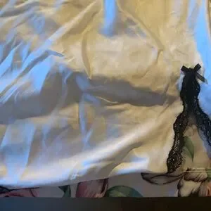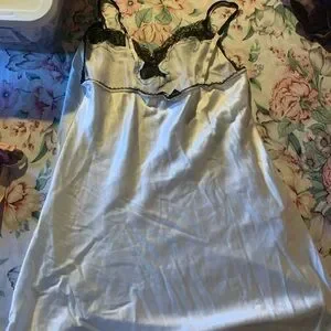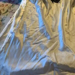 Chic white chemise with elegant black lace accents. Soft and luxurious feel. The size is large. The shade is white and black lace. It has a slit on the side just look at the photos.