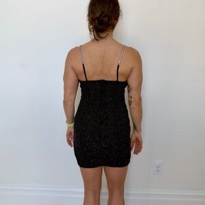 Dazzle in this Astr mini dress. Black with shimmering details. Perfect for nights out. Lightweight, stretchy, and actually comfortable. Shown without a bra. Wore for NTY and a dinner.