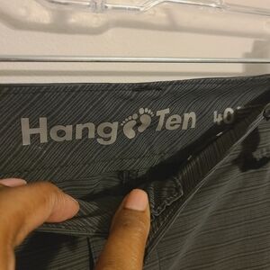 Men's gray and black striped hiking or athletic shorts by Hang Ten, waist size 40. Lightweight shorts have internal draw cords, front slant pockets, an extra zipper pocket on the right and two back button pockets in the back. Fabric blend of polyester and elastane. Belt loops to add belt if needed. Excellent pre-owned condition; no flaws.