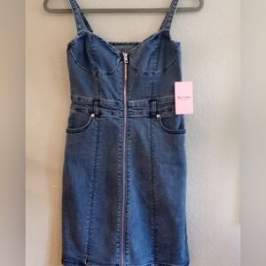 Juicy Couture Sweatheart Bustier Neckline Denim Dress with Full Zippered front, Adjustable Spaghetti Straps, Bodycon, Coquette Girl, Farmercore, Festival, Scandi Girl, Cottagecore, Indie Sleeze, Y2K, Casual, Versatile Layer, Bohemian, Boho,