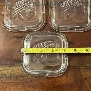 Vintage Clear Federal Glass Refrigerator Dish lids 4" Embossed Vegetables Set 3. 2 of the lids have very tiny chips on underneath of lids as pictured.