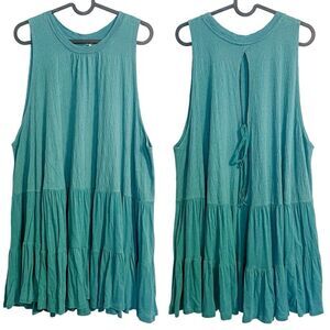 Features: sleeveless, crew neck, wide arm holes, keyhole back with tie detail, tired skirt, long length