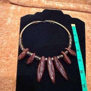 This brown, elongated ceramic pieces interspersed with glass and gold metal beads choker necklace is perfect for adding a touch of sophistication to any outfit. The unique design features beautifully crafted beads that catch the light with every movement. The hook closure can easily be extended by adding a chain extender. Beautiful Preloved condition- please review all photos.