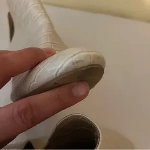 GUC—a few light scuffs on one side and the toe of one boot (see photos) Also the glue is showing a small amount on one of the v’s.
