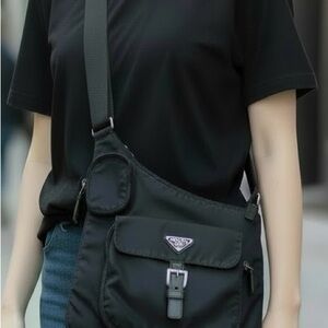 Prada Logo Plate Shoulder Crossbody Bag Tessuto Nylon Black