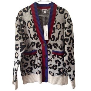 Relaxed cardigan with dropped shoulders covered in leopard pattern.