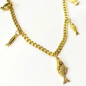 Features: gold plated stainless steel, double sided fish charms, nice heavy weight chain
