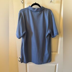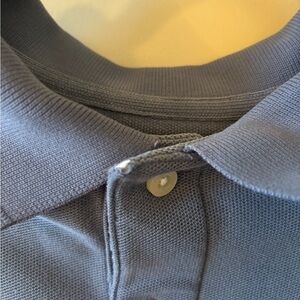 This is a sky blue polo. Soft fabric. Perfect for casual outings. It has a bit of wear but still has a lot of life left in it.