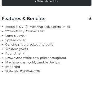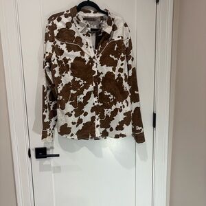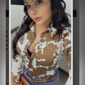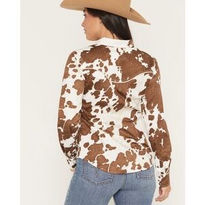 Eye-catching western shirt with a bold cow print. Features classic button-up style. See photo missing button in the middle