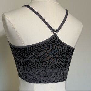Minimal, sleek, and ultra-comfortable, this Pro-Fit seamless sports bra has a stretchy body-hugging fit with a gray and black abstract pattern. Removable padding (not included)
