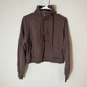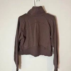 All in Motion brown quarter zip pullover sweatshirt offers a modern, athletic look with its cropped silhouette and high funnel neck. Constructed from a soft fleece-lined cotton blend, this activewear piece includes adjustable drawstrings at the collar and ribbed cuffs for a secure fit. The back features curved seam detailing that enhances the sporty aesthetic, while the front zipper allows for versatile styling and temperature control. Note that there is a faint dark spot on the back lower right side as shown in photos.