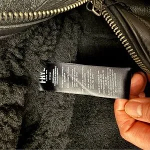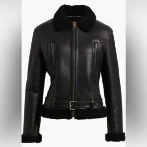 Chic black leather jacket with plush shearling trim. Features zippered pockets and buckle details. Ideal for stylish layering.