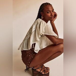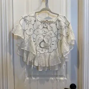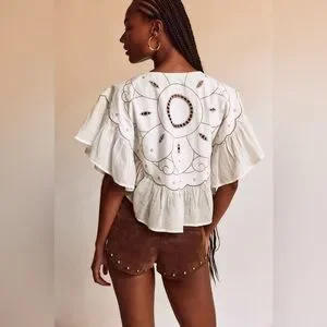 Turn heads in this statement blouse, featured in a cropped, cape-inspired silhouette with delicate embroidery and intentional cut-outs for the perfect flowy, fluttery option.