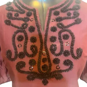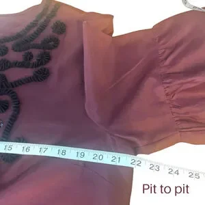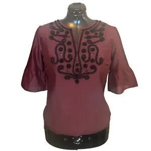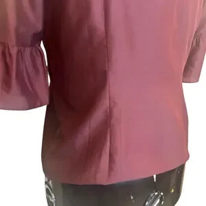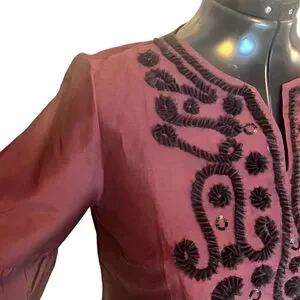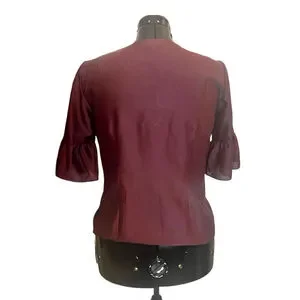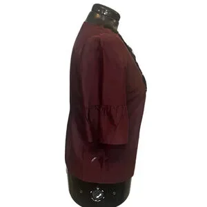 A sophisticated, stand-out top by Talbots RSVP line. This burgundy silk blouse is rendered special by subtle tulle ribbon, sequin embellishments and three quarter sleeves with a ruffle tier.