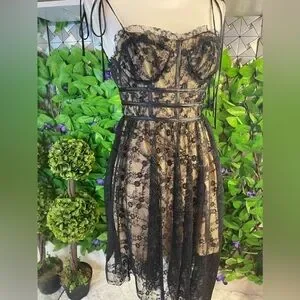 This stunning Steve Madden lace midi dress in size XS features a black floral lace overlay with nude lining and a high-low hemline. The sleeveless design and back zip closure provide a flattering fit, making it perfect for cocktail parties, special events, or casual wear. New with tags, this dress combines elegance and comfort, ensuring you make a stylish statement. Originally retailed at $129.