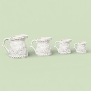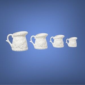 Vintage elegant Napco white ceramic measuring cups designed to look like small pitchers with embossed grape and vine design. Perfect for serving or decor. 4 measuring units. Made by Napco out of Japan during the mid-century.