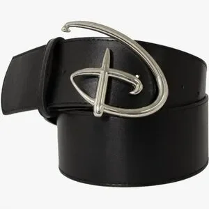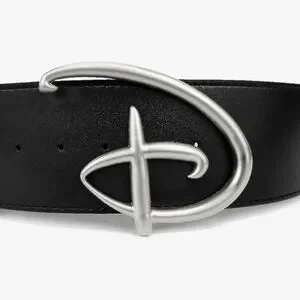 Elevate your style with this sleek black leather belt featuring a distinctive silver buckle in the shape of the Disney logo.