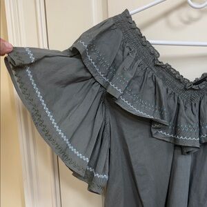 Chic I’ve Hreen blouse with ruffled neckline. Elegant off-shoulder style.