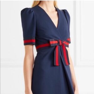 Chic navy midi dress by Gucci. Features bold red ribbon detail. Perfect for stylish occasions.