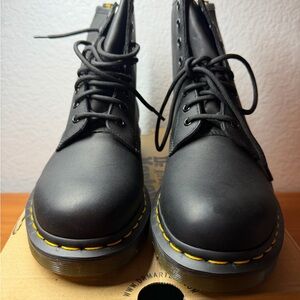 De. Martens 1460 Greasy Women’s 9 Classic black leather boots with sturdy lace-up front. Iconic yellow stitching adds a bold touch.