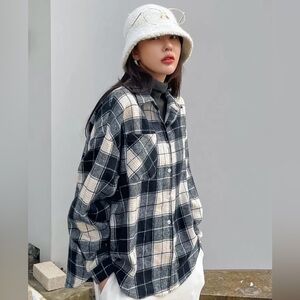 Stylish plaid button-up shirt in black and cream. Perfect for casual outings and layering. Enhance your wardrobe with this versatile piece.