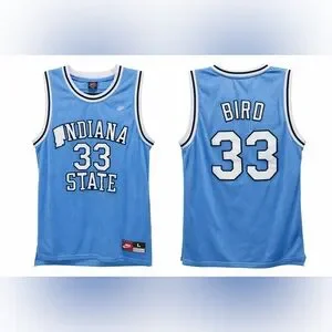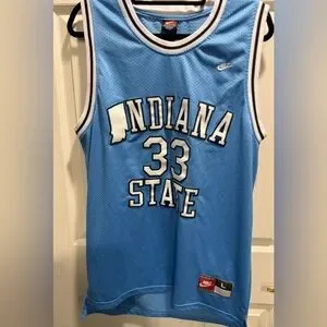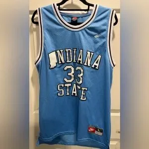 Authentic Nike Indiana State basketball jersey featuring Larry Bird #33 in classic light blue. Breathable mesh fabric with stitched Nike jock tag and heat-pressed graphics. A must-have for NCAA fans, vintage basketball collectors, and Larry Bird memorabilia collectors.