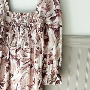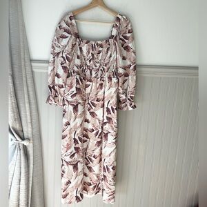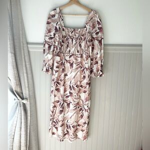 Chic midi dress with a mauve and cream leaf pattern. Features a smocked bodice and puff sleeves. Perfect for stylish outings.