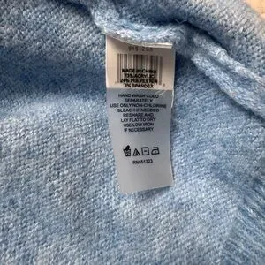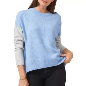 Chic and comfortable crew neck sweater. Features a light blue body with gray sleeves. Ideal for casual wear.