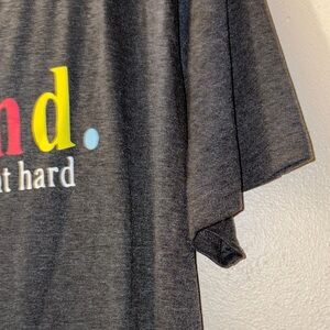Dark gray graphic tee featuring a multicolor 'Be Kind' print. Comfortable and stylish.