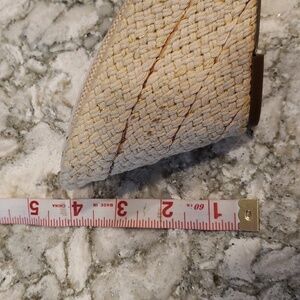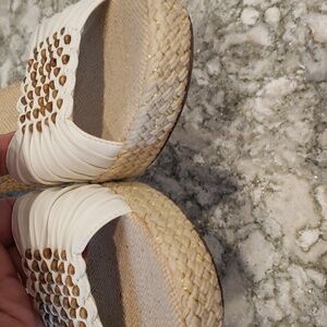 Coldwater Creek wedge slide sandal with fabric and woven details, beaded detail at toe.