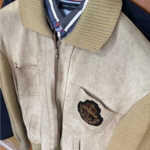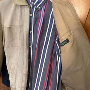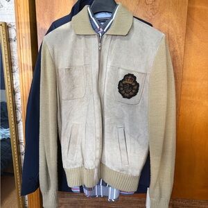 Stylish Polo by Ralph Lauren jacket. Features a beige body with tan sleeves. Embroidered logo on chest. Perfect for casual wear.