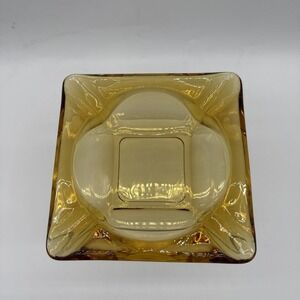 The product is a vintage Anchor Hocking large 6" amber square glass ashtray designed in the mid-1960s. This handmade ashtray was manufactured in the United States, adding to its collectible value. With its retro Mid-Century design, this ashtray is a unique piece that would appeal to collectors of vintage decor.