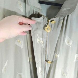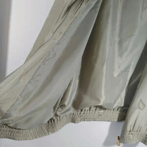 Gorgeous, eye-catching jacket in a light olive green. Almost has a silvery sheen to it! Zip front with additional button flap. Slash pockets. Small shoulder pads. Elastic banded bottom; has good stretch. In good pre-owned vintage condition with expected wear for usage; garment may have small spots or minor wear consistent with age and usage. Variations in color are due to lighting and the nature of the garments silk material. Please see pictures for further details. From our smoke-free home 🏡