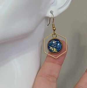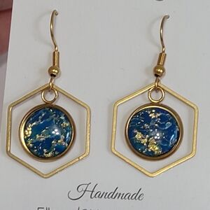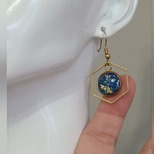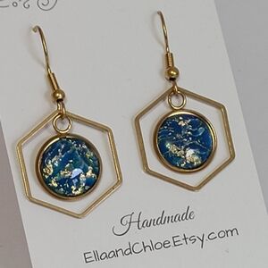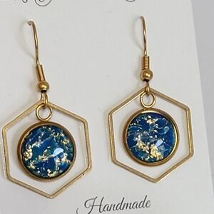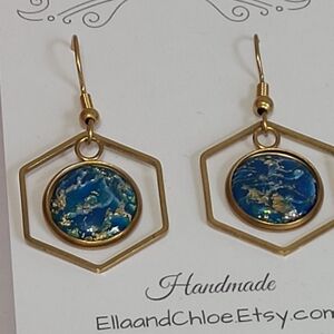 Boho Blue Gold Marble Artisan Geometric Elegant Drop Dangle Gold Tone Earrings