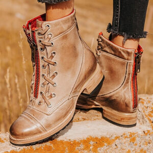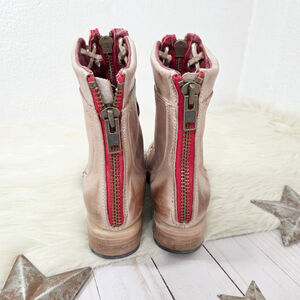 Freebird By Steven Liverpool Zipper Combat Boots in a light brown distressed leather with bright red accents.