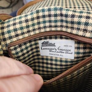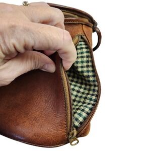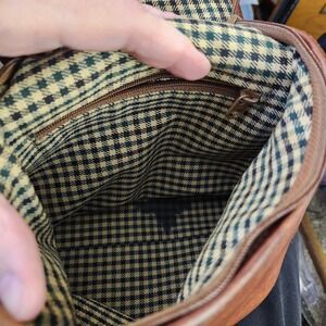 Vintage Ghurka Marley No. 138 leather backpack in a rich chestnut brown. This handmade piece features the brand's signature high-quality leather construction with a unique circular top handle and adjustable shoulder straps. The interior is lined with a classic green and tan check fabric and includes a zippered security pocket. Brass hardware accents and embossed logo detailing on the front flap showcase the authentic craftsmanship of this Norwalk, Connecticut-made bag.