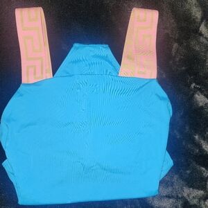 Crop top in vibrant blue. Features bold pink straps. Stylish and modern design. Worn once. Size 2, tag size removed. Let's make a deal.